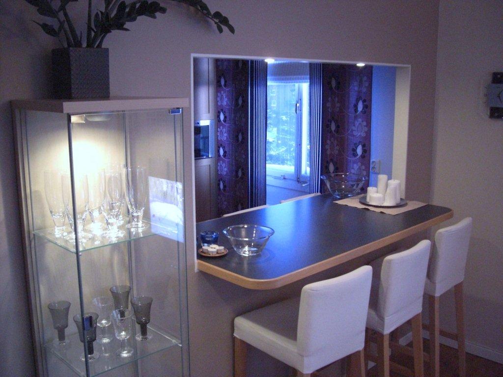 Baren och balkongen sedda från vardagsrummet. Baren fungerar som ett extra fönster.