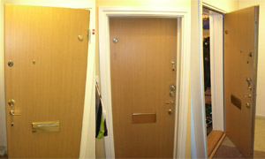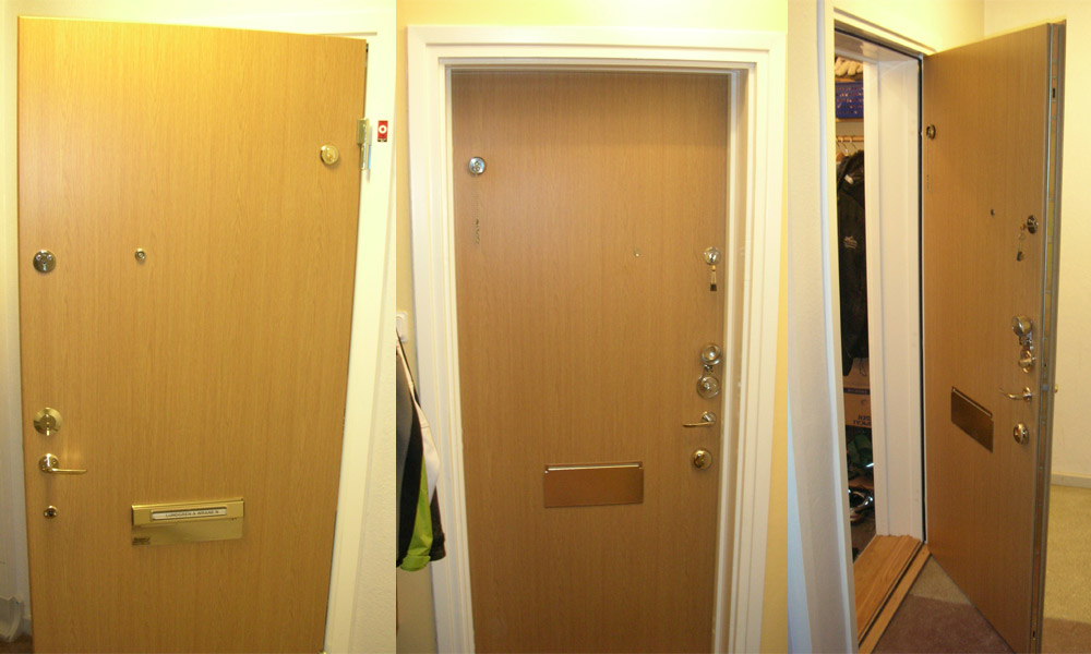 Även ytterdörren är ny. Märket är Daloc som skryter med såväl bra ljudisolering som hög brand- och inbrottssäkerhet.