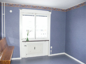 Sovrummet fick förbli intakt vid inflytten (jag skulle ju ändå göra om). Inte bara väggar och platsmatta är blåa utan till och med persiennerna! Notera också gärna den stiliga takboarden ...