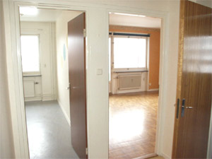 Så här såg det ut med dörrar och väggar i hallen innan renoveringen. Notera den blågrå plastmattan i köket och en liten fläck av den ljusgula i hallen.