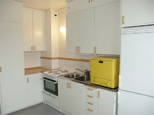 Köket såg ut så här precis före renoveringen, så när som på diskmaskinen som försvann redan innan inflytt.
