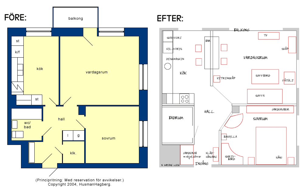 Planritningen från prospektet i januari 2004 ihop med planskissen jag gjorde själv vintern 2006.